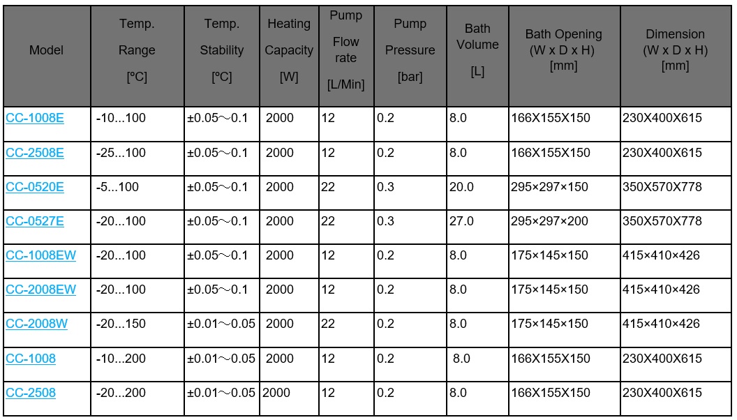 - Bể điều nhiệt tuần hoàn model CC-2508E là bể ổn nhiệt có bơm tuần hoàn sử dụng dùng để ổn định nhiệt độ tại giải nhiệt độ từ -25 oC tới +100 oC cho các ứng dụng làm ấm bình phản ứng, ổn nhiệt cho mẫu, nuôi cấy mô tế bào, phân tích enzim hay điều điều nhiệt áo nước tuần hoàn cho các thiết bị khác như cột sắc ký, nhớt kế, tỷ trọng kế….
