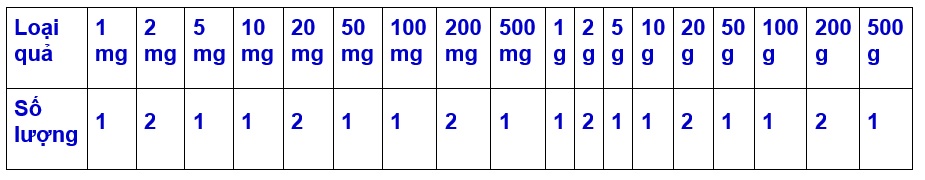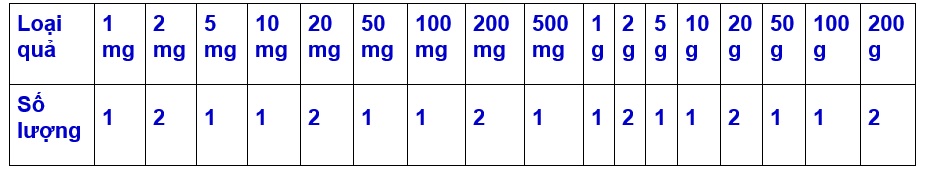 - Quả cân bao gồm: hộp đựng riêng từng quả cân, chia ngăn, chứa trong hộp bằng nhôm ( như hình) có chốt đóng, có nhung đen lót bảo vệ bên trong cho quả cân