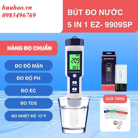 - Bút đo độ mặn, pH, TDS, EC EZ-9909SP là một bút đo kỹ thuật số đa năng, một máy đo chất lượng nước đa chỉ tiêu với khả năng đo được 5 thông số của nước: độ pH, tổng chất rắn hòa tan TDS, độ dẫn điện EC, độ mặn, nhiệt độ của nước và các loại dung dịch lỏng. Máy được ứng dụng trong nhiều hoạt động, ngành nghề lĩnh vực: kiểm tra các bể nước, bể cá, bể bơi, phòng thí nghiệm, các hoạt động nông nghiệp: thủy canh, thủy sinh, thủy sản...