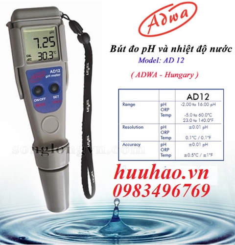- Bút đo ph AD-12 là thiết bị chuyên dùng để đo độ pH và nhiệt độ của nước trong ngành nuôi trồng thủy sản, thủy sinh, nông nghiệp, bể cá, nước thải, nước máy, nước trong ao hồ chuyên nuôi trồng thủy hải sản, nước thâm canh...