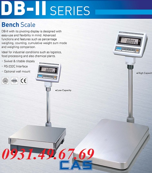 - Cân bàn điện tử CAS DB-II, DB-II F với các mức khối lượng cân 30kg, 60kg, 150kg, 300kg, 600kg được nhập khẩu nguyên chiếc từ hãng CAS-Korea với các tính năng tiên tiến đáp ứng mọi yêu cầu về chất lượng theo tiêu chuẩn Quốc tế OIML, ISO 9001. Cân điện tử Cas DB-II, DB-II F là một trong những loại cân bàn bán chạy nhất tại Việt Nam.