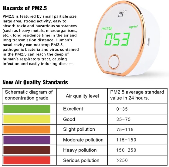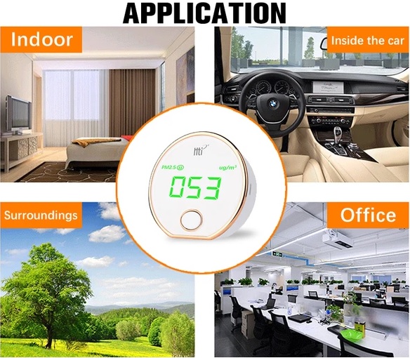 - Đồng hồ đo độ bụi PM2.5 cầm tay với kích thước nhỏ gọn và trọng lượng nhẹ nên rất dễ mang theo và vận hành. Nó có thể hiển thị nồng độ và mức độ biểu hiện PM2.5 cùng một lúc. Nó phù hợp cho các hộ gia đình trong nhà, khách sạn, xe cộ, văn phòng và môi trường tự nhiên…