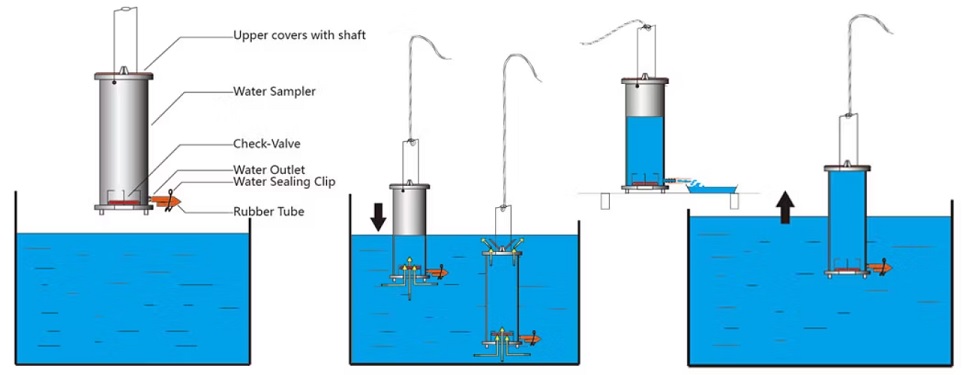 - Khi lấy mẫu, dụng cụ lấy mẫu nước liên tục rơi xuống, van ở phía dưới mở ra dưới áp suất, sau đó cổng dịch chuyển phía trên được mở ra, lúc này mẫu được thay thế liên tục. Khi dụng cụ lấy mẫu đạt đến độ sâu lấy mẫu, van dưới và nắp trên sẽ tự động đóng lại để lấy mẫu. Có thể lấy mẫu ở bất kỳ độ sâu nào và việc lấy mẫu đều chính xác.