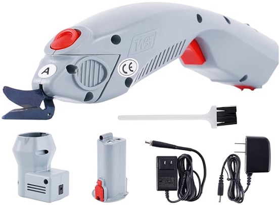 - Máy cắt vải này đi kèm pin NI-MH 2200mAh, pin được sạc đầy chỉ trong 2 giờ và có thể hoạt động liên tục (nhấn công tắc và bật) trong 1 giờ.