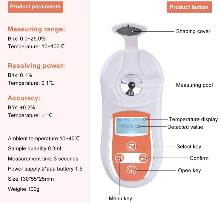- Độ phân giải: ± 0.1% Brix/±. 1 °C (± 1 °F)