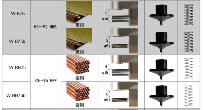 - Kìm đo độ cứng của Đồng thau ở trạng thái cứng hoặc nửa cứng, hợp kim nhôm siêu cứng W-B75, W-B75b (63-105 HRF), W-B75 (chiều dày mẫu 0.4-6, đường kính trong >10), W-B75b (chiều dày mẫu 0.4-8, đường kính trong >6)