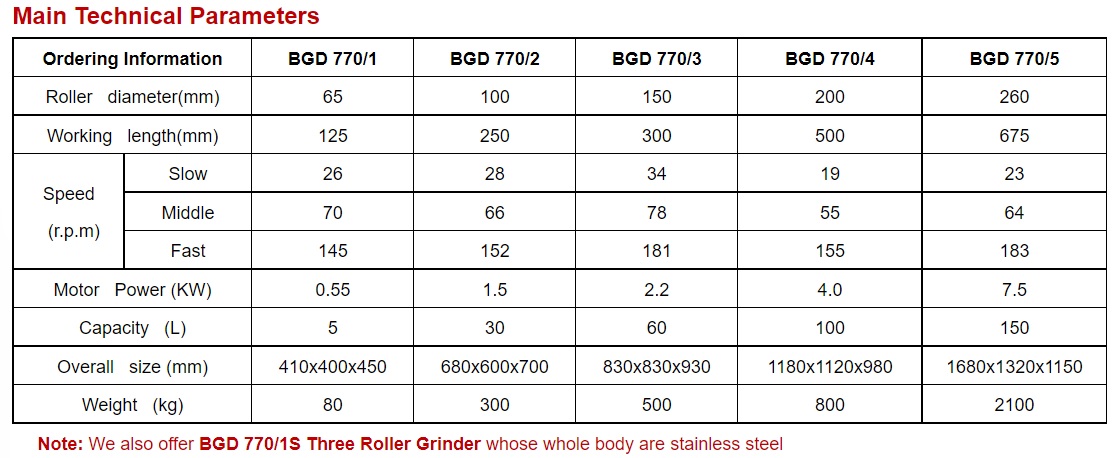 - Máy cán nghiền con lăn 3 trục series BGD 770 được sử dụng rộng rãi trong các vật liệu dán bao gồm mực, sơn, bột màu, xà phòng, da nhân tạo, nhựa, mỡ bôi trơn, sô cô la, mỹ phẩm, dược phẩm.... Đặc biệt đối với vật liệu có độ nhớt và độ mịn cao.