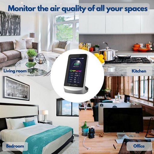 - Là một thiết bị phát hiện chất lượng không khí khoa học, nó kết hợp nhiều cảm biến không khí với quạt tích hợp cho phép giám sát theo thời gian thực về Carbon dioxide (CO2), formaldehyde (HCHO), tổng hợp chất hữu cơ dễ bay hơi (TVOC), độ bụi mịn PM2.5/1.0 /10, nhiệt độ và độ ẩm trên màn hình LCD kỹ thuật số.