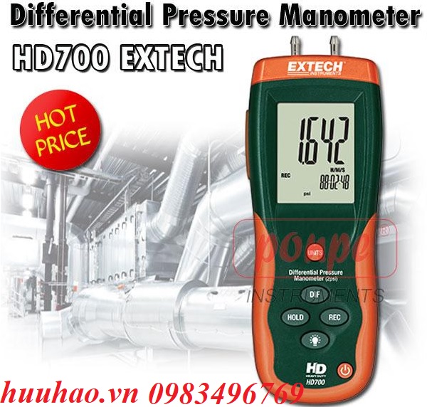 - Máy đo chênh áp 0 đến 2 psi Extech HD700 là dụng cụ đo chênh áp cầm tay. Với thang đo từ 0 đến 2 psi, máy cho phép đo và hiển thị chính xác các đại lượng như psi, mbar, kPa, inHg,... Đặc biệt, kết quả đo cho được hiển thị trực tiếp trên màn hình LCD với màn hình hỗ trợ sáng.