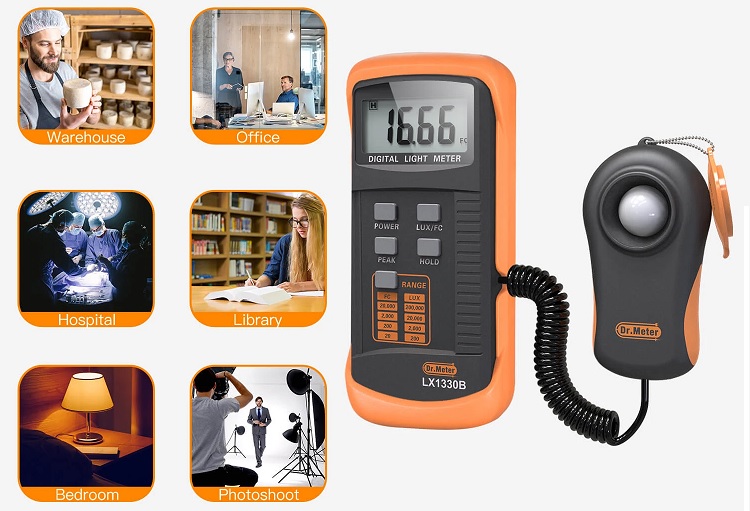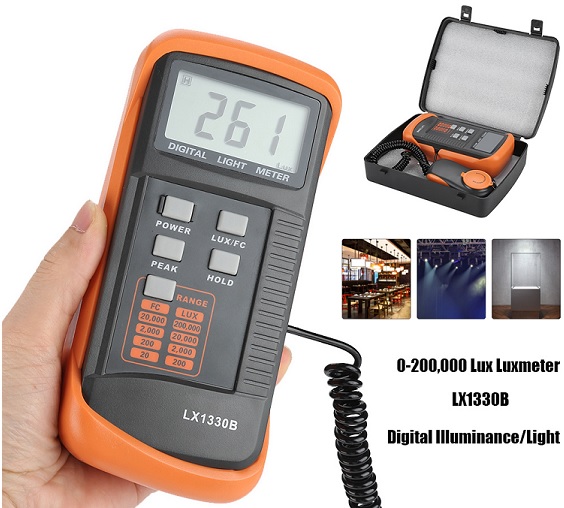 - Máy đo cường độ ánh sáng LX-1330B dùng để đo độ chiếu sáng và ánh sáng rơi trên một mặt phẳng, máy gồm có 4 thang đo với màn hình tinh thể lỏng có thể di chuyển rộng khắp để có thể đo được ánh sáng.
