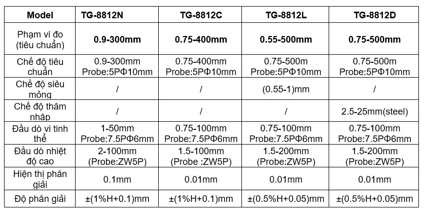 Thông số kỹ thuật Thiết bị đo độ dày siêu âm HUATEC TG-8812N
