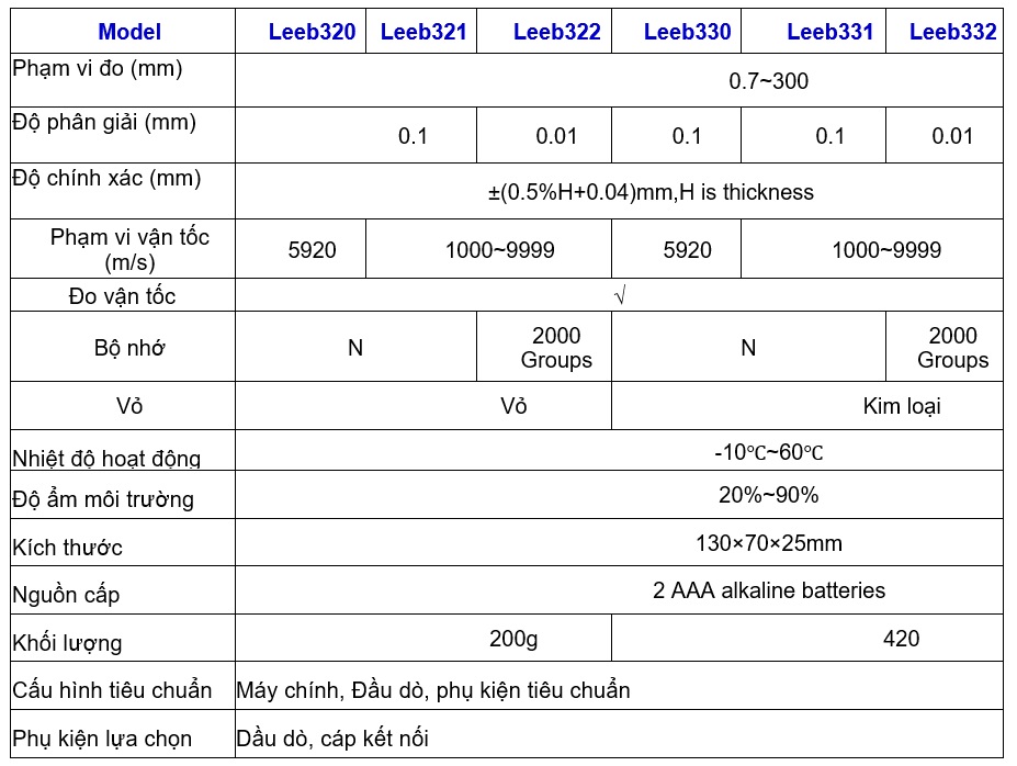 Thông số Máy đo độ dày bằng siêu âm Leeb320, Leeb321, Leeb322, Leeb330, Leeb331, Leeb332