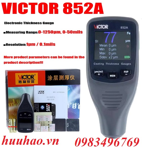 - Máy đo độ dày điện tử Victor 852A cầm tay này được sử dụng để đo nhanh và chính xác độ dày của lớp phủ hoặc mạ điện trên bề mặt kim loại. Nó không chỉ cho biết độ dày của lớp phủ hoặc mạ điện mà còn tự động xác định vật liệu nền nào được sử dụng (Fe có nghĩa là kim loại từ tính như sắt & thép; NFe có nghĩa là kim loại không từ tính, như nhôm, hợp kim & thép không gỉ không từ tính).