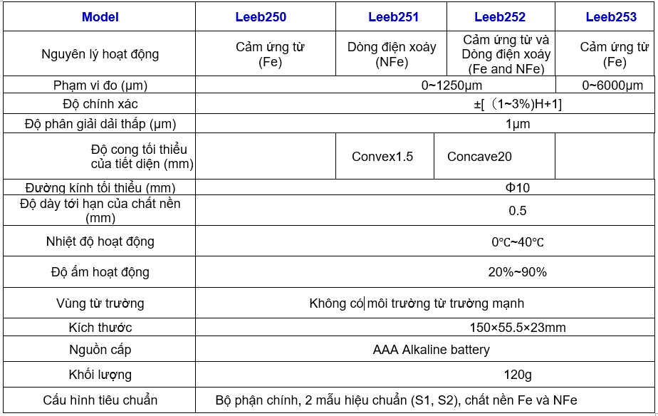 Thông số Máy đo độ dày bằng siêu âm Leeb230, Leeb231, Leeb232