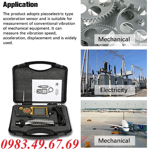 - Máy đo độ rung kỹ thuật số HT-1201 Hti instrument sử dụng cảm biến gia tốc loại áp điện và phù hợp để đo độ rung thông thường của thiết bị cơ khí. Nó có thể đo tốc độ rung, gia tốc, độ dịch chuyển và được sử dụng rộng rãi trong sản xuất cơ khí, năng lượng điện, kỹ thuật hóa học, chuyến bay vũ trụ và hàng không và các lĩnh vực khác.