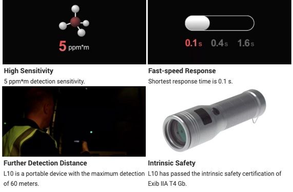 - Công nghệ quang phổ hấp thụ diode laser có thể điều chỉnh được sử dụng trong L10 có độ nhạy cao, tốc độ phản hồi nhanh và độ chọn lọc tốt. Nó chỉ phản ứng với khí mê-tan và sẽ không gây ra báo động sai đối với các loại khí hydrocacbon khác. Nó sử dụng pin lithium để cung cấp năng lượng, tiêu thụ điện năng thấp và tuổi thọ cao. Giao diện hoạt động của phần mềm trực quan và thân thiện, có chức năng báo động bằng âm thanh và ánh sáng. Nó có thể được sử dụng rộng rãi ở những nơi có thể xảy ra rò rỉ khí, chẳng hạn như đường ống dẫn và phân phối khí đô thị, nhà máy lọc dầu, nhà máy hóa chất, công nghiệp luyện kim và công nghiệp điện trong ngành dầu khí và hóa dầu.