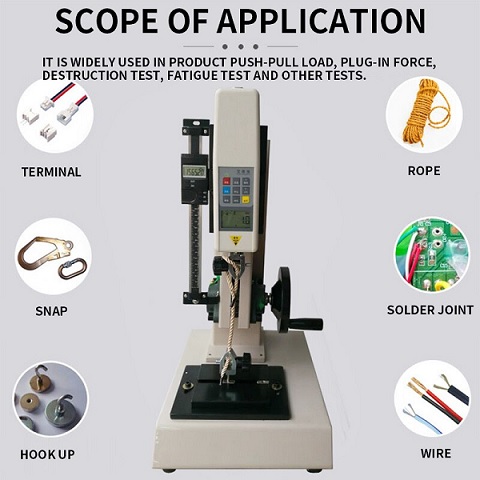 Ứng dụng: Để kiểm tra độ bền sản phẩm khi có một lực tải kéo hoặc lực đẩy nén tác động, thường kiểm tra các bộ phận điện tử, phụ tùng xe hơi, polyme, nhựa, dây điện, cao su,... máy thử tải này cung cấp.