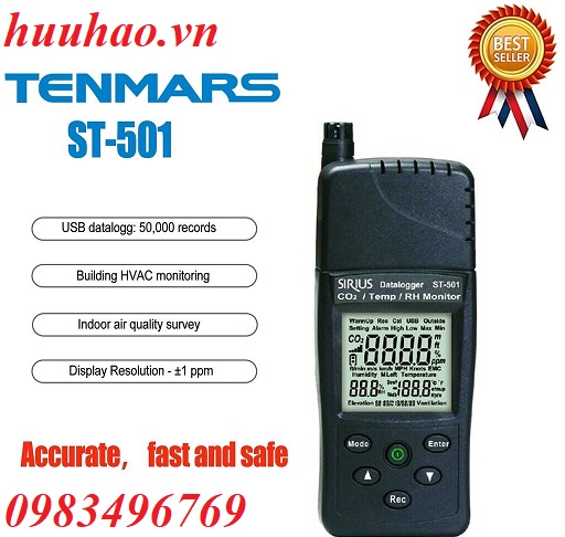 - Tenmars ST-501 là một dụng cụ tuyệt vời dùng để đo chất lượng không khí trong nhà (IAQ). Đo khí CO2, độ ẩm tương đối (RH) và nhiệt độ. Thiết kế nhỏ gọn có khả năng để bàn hay treo tường. Giám sát nồng độ khí CO2 trong nhiều môi trường, qua đó đưa ra phương pháp nhằm ngăn chặn sự gia tăng của nồng độ khí CO2 gây ảnh hưởng đến con người.