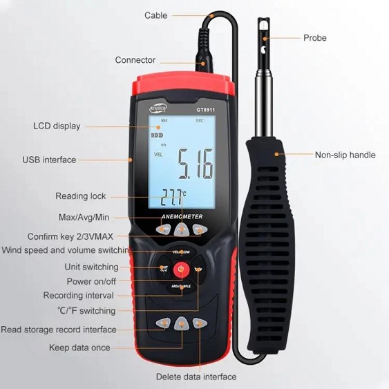 - Model GT8911 hãng Benetech là thiết bị đo vận tốc gió, nhiệt độ gió, lưu lượng gió có độ ổn định, an toàn và độ tin cậy vượt trội. Máy có chức năng tự động tính toán lưu lượng gió và giúp người dùng đo và ghi lại dữ liệu bất kể đo trong nhà hay ngoài trời. Đầu dò nhỏ của máy giúp nhân viên HVAC/R chuyên nghiệp đo vận tốc gió bên trong ống thông gió một cách dễ dàng. Benetech GT8911 được sử dụng rộng rãi trong các lĩnh vực Điện, Hàng hải, Sản xuất quạt, Hệ thống điều hòa không khí, Thể thao...