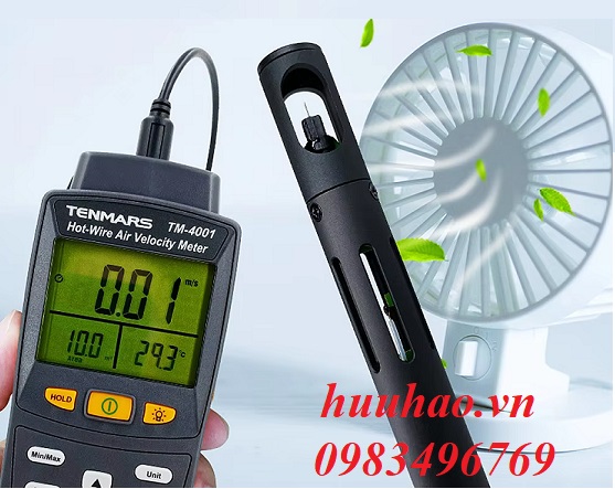 - Tenmars TM-4001 được dùng làm máy đo tốc độ gió (Hot-wire) trong nhiều khu vực kèm một đầu dò dài phản hồi nhanh, có khả năng đo trong nhiều ngóc ngách các đường ống, quạt thông gió. Máy có thiết kế nhỏ gọn dùng rất dễ dàng. Hiển thị với màn hình rộng dễ đọc. Bên cạnh đó TM-4001 đo nhiệt độ, độ ẩm và lưu trữ lên tới 99 số đo.