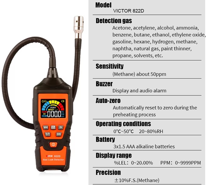 Thông số kỹ thuật máy phát hiện rò khí gas Victor 822D