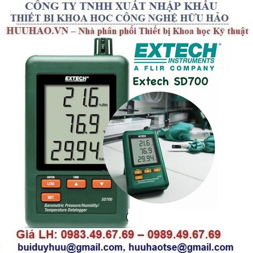 - Extech SD700 là nhiệt ẩm kế áp kế tự ghi dữ liệu nhỏ gọn. Máy có khả năng đo nhiệt độ từ 0 đến 50 ° C, độ ẩm từ 10 đến 90% RH, và ghi áp suất 10 đến 1100 hPa. Khả năng ghi lại dữ liệu lên tới 20 triệu điểm với thẻ nhớ ngoài.
