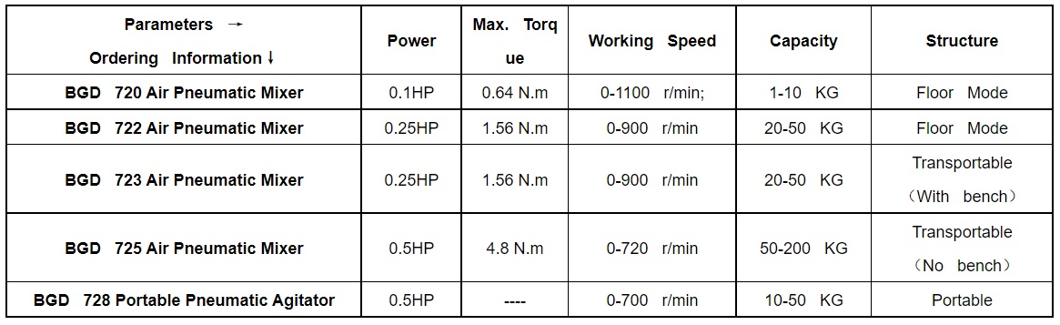 Thông số kỹ thuật máy trộn khí nén BGD 720, BGD 722, BGD 723, BGD 725, BFD 728