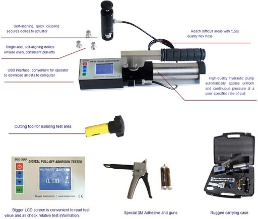 - Thiết bị kiểm tra độ bám dính BIUGED BGD 500 là một thiết bị cầm tay, vận hành bằng tay, được sử dụng để đo lực cần thiết để kéo một đường kính thử nghiệm xác định của lớp phủ ra khỏi đế bằng áp suất thủy lực.