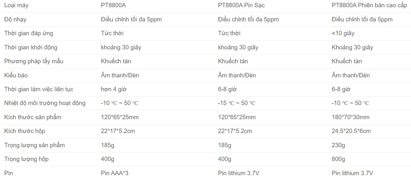 Thông số kỹ thuật máy dò khí gas, khí cháy PT8800A, PT8800A Pin Sạc và Phiên bản PT8800A cao cấp: