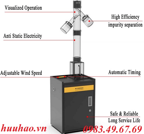 - Ứng dụng: Máy làm sạch hạt bằng không khí thổi từ dưới lên đi qua ống nhựa hình trụ trong suốt. Ống nhựa được thiết kế để thu lại các hạt nhẹ và vỏ trấu, chỉ có các hạt sạch còn lại ở dưới đáy cột