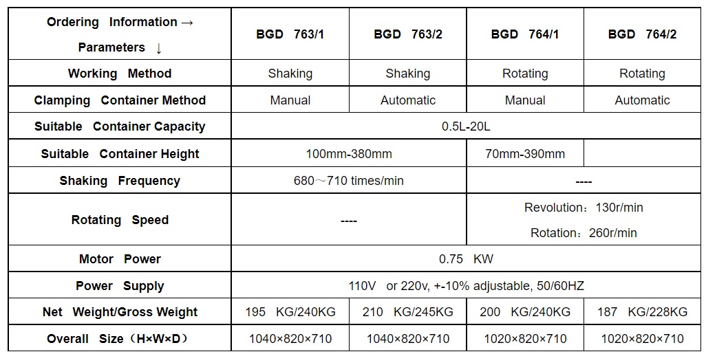 Thông số kỹ thuật máy lắc sơn BGD 763/1, BGD 763/2