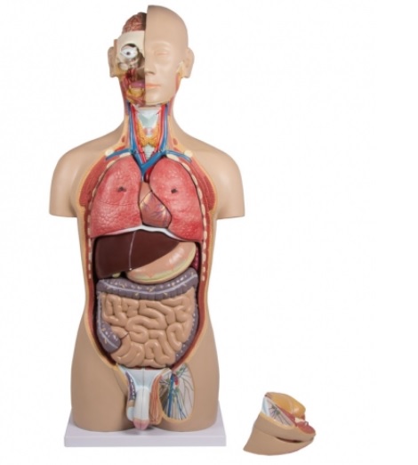 - Mô hình có thể chia thành các phần sau: bán thân, một nửa của bộ não, mắt, phổi phải hai phần, phổi trái hai phần, tim hai phần, khí quản, thực quản, gan, dạ dày hai phần, tụy, tá tràng và lá lách, một nửa của một bên thận, ruột, van hồi tràng, hệ t niệu sinh dục nam, nữ 4 phần, đốt sống ngực.