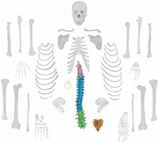 - Mô hình bộ xương người rời có kích thước chuẩn này với tất cả 206 xương được đúc riêng lẻ với chi tiết giải phẫu đặc biệt. Bộ xương có một tay và một chân được khớp nối bằng dây, hộp sọ gồm 3 phần, nắp hộp sọ có thể tháo rời và hàm dưới được gắn lò xo. Xương cột sống được lắp ráp, với các vùng khác nhau được đánh mã màu và dán nhãn.