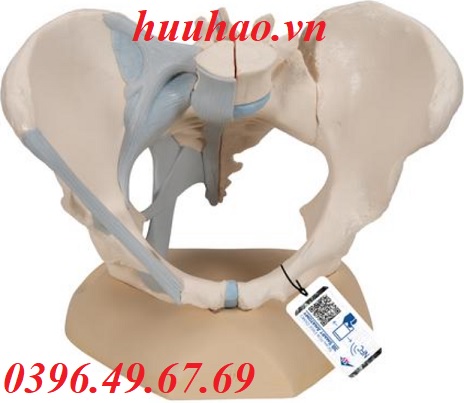 - Mô hình khung xương chậu nữ kích thước thật với các dây chằng chính ở bên phải và cho thấy các chi tiết của xương hông, khớp mu, xương cùng, xương cụt và đốt sống thắt lưng thứ 5 với đĩa đệm.