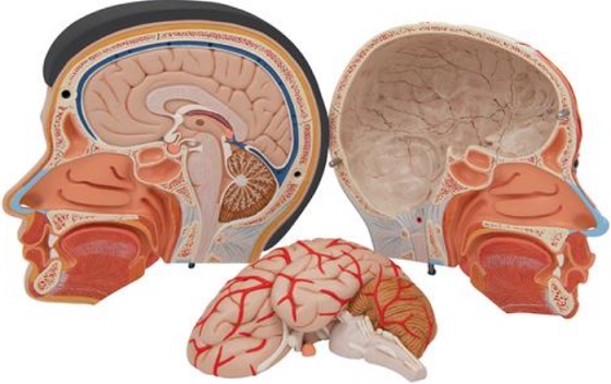 - Nửa bên trái của mô hình kích thước thực này ở phần giữa cho thấy các cơ, với dây thần kinh, mạch và cấu trúc xương và chứa một nửa não có thể tháo rời. Đầu được gắn trên phần cổ có thể tháo rời được cắt theo cả chiều ngang và đường chéo. Cung cấp trên chân đế.