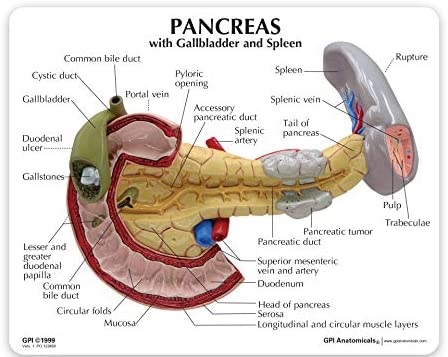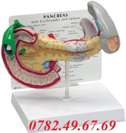 - Mô hình bệnh lý vùng tụy thể hiện cấu trúc giải phẫu của tuyến tụy, tá tràng, túi mật và lách cũng như động mạch thân tạng, tĩnh mạch cửa gan và các mạch máu khác. Đồng thời, mô hình còn thể hiện bệnh lý của các cơ quan tiêu hóa như tụy, tá tràng, túi mật...