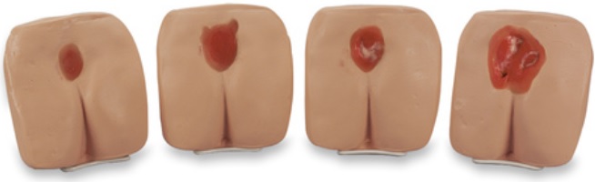 - Mô hình thể hiện vết thương do tỳ đè từ cạn và đỏ nhẹ trên da đến vết thương hở nhiễm trùng, sâu, xuyên tận xương đến phần mô chuyển đen hoặc chết. Thực hành chăm sóc và làm sạch, bốn giai đoạn gồm: