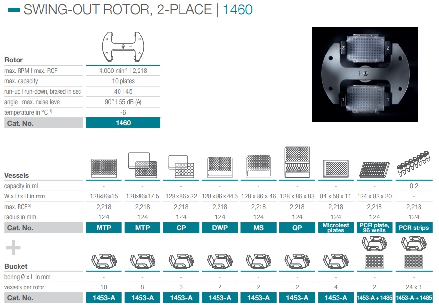 Hettich 1460 Swing-out rotor, 2-place, Hettich 1460 Microplate Rotor and Buckets