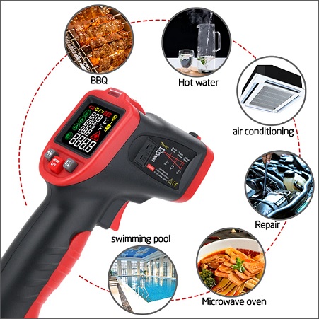 - Nhiệt kế hồng ngoại được sử dụng để đo nhiệt độ bề mặt của các vật thể. Nó phù hợp cho tất cả các loại vật nóng, nguy hiểm hoặc khó chạm vào. Nó có độ chính xác cao, phản ứng nhanh, kích thước nhỏ, trọng lượng nhẹ và thao tác đơn giản.