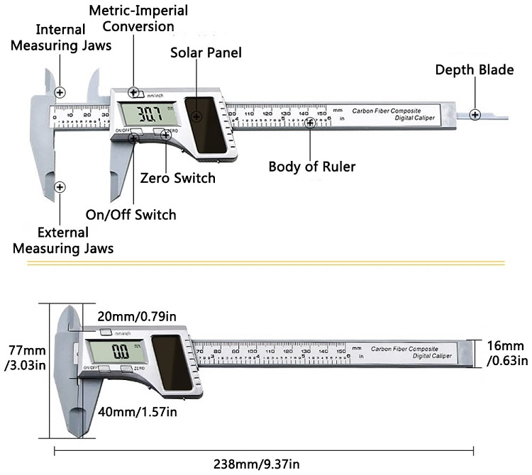 Thước kẹp điện tử pin năng lượng mặt trời 150mm sợi carbon tổng hợp