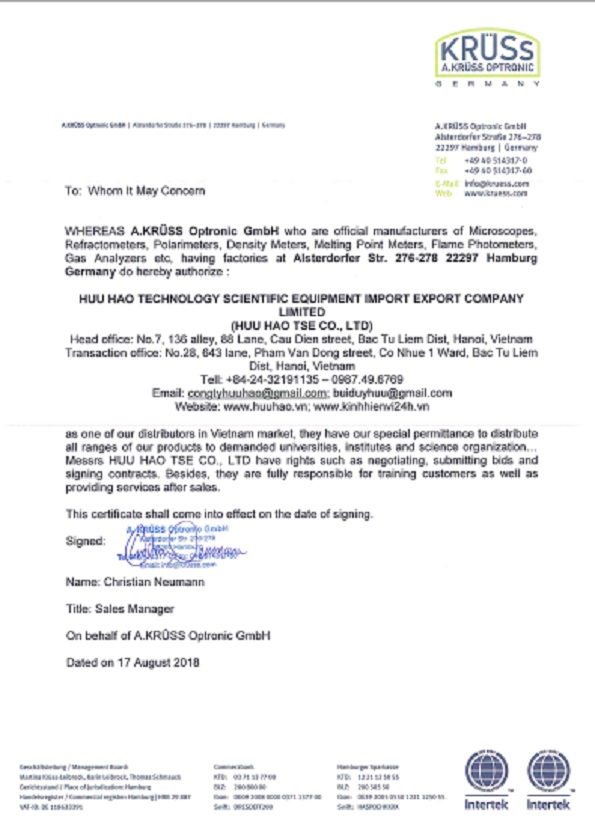 Công ty TNHH Xuất nhập khẩu Thiết bị Khoa học Công nghệ Hữu Hảo tự hào khi được hãng Kruss - Đức ủy quyền thay mặt hãng cung cấp kính hiển vi của hãng trên toàn lãnh thổ Việt Nam. Các sản phẩm mà hãng ủy quyền cho Công ty Hữu Hảo phân phối bao gồm đầy đủ giấy tờ chứng nhận chất lượng, chứng nhận xuất xứ (CO, CQ) và đều được bảo hành theo chính sách của hãng. | |
