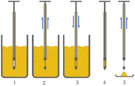- Ở độ sâu cần thiết, xoay thanh bên trong để mở khóa, để Mô-đun lấy mẫu tiếp xúc. Bột sẽ chảy vào xung quanh đầu mút (Mô-đun lấy mẫu).